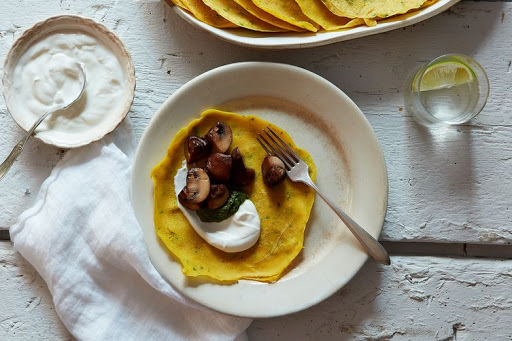 Cook for around 30 seconds, then lift up to see if it has browned on the underside. If so, flip the pancake over and cook for another 30 seconds before shuffling onto a plate. Carefully rub the pan with butter again and repeat with the rest of the batter.