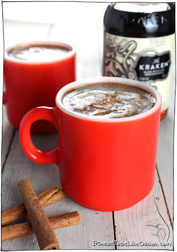 Pour a shot of the rum into each mug, then heat up the non-dairy milk and water together until simmering and divide among the two mugs. Stir to dissolve the brown sugar. Now if you like, add a dollop of coconut cream on top and an extra sprinkle of cinnamon. Pure, creamy, adult bliss this stuff is. Cheers!