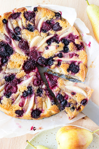 Pour into a round baking pan and cover with sliced pears and frozen berries**.
