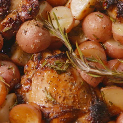 In a large skillet over medium-high heat, heat remaining tablespoon oil. Add chicken and marinade and sear, skin side down, 2 minutes, then flip and sear 2 minutes more. Add potatoes to skillet, nestling them between chicken, and rosemary sprigs.