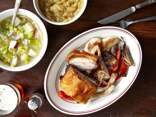Transfer the roasted vegetables to a large serving platter. Cut the pork belly into 3-inch pieces, arrange over the vegetables, and garnish with the cracklings. Serve the pork and vegetables with the applesauce on the side.