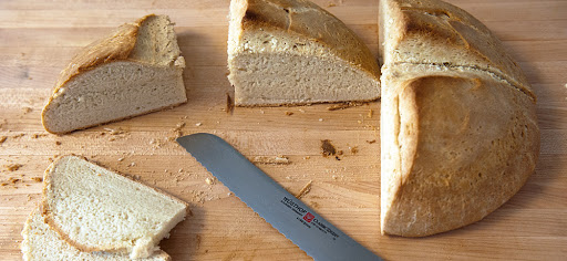3. Preheat the oven to 350°. Uncover the dough and use a chef’s knife to slash the top of the dough with an “X.” Drizzle some oil over the top of the loaf and bake until golden and the bread sounds hollow when tapped, 40 to 45 minutes. Remove from the oven and transfer the loaf to a wire rack. Serve warm or completely cooled.