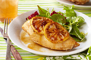 TOSS lettuce with remaining dressing mixture. Serve with chicken. Discard lemon slices or use as a garnish.