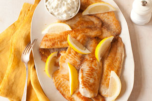 MIX cheese and flour in pie plate. Dip fish, 1 fillet at a time, in cheese mixture, turning to evenly coat both sides of each. Heat oil and butter in large nonstick skillet on medium-high heat until butter is melted. Add 3 fish fillets; cook 4 to 5 min. on each side or until fish flakes easily with fork. Remove from skillet; cover to keep warm. Repeat with remaining fish fillets.