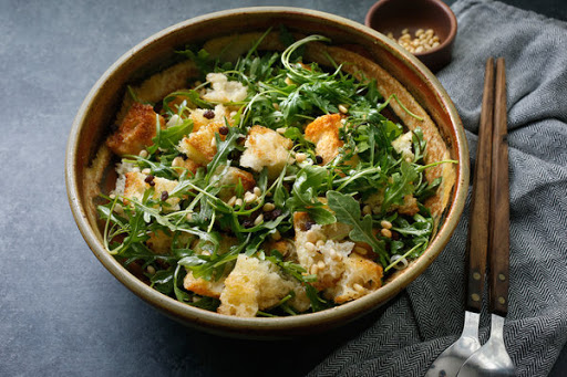 Heat oven to 450 degrees. Place bread salad in oven, turn off heat, and leave for 15 minutes. Return salad to bowl. Add greens, remaining vinaigrette, and enough of remaining olive oil so bread is not dry. Toss again. Serve with grilled or roasted meat.