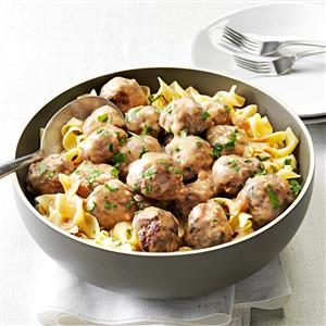Meanwhile, cook noodles according to package directions. Drain; toss with butter. Serve with meatball mixture; sprinkle with parsley.