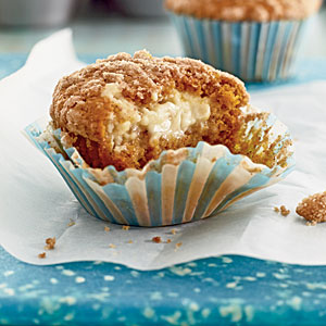 5. Spoon half of batter into prepared muffin pans. Dollop about 1 tablespoon reserved cream cheese mixture in center of batter, and top evenly with remaining batter. Sprinkle with reserved streusel mixture.