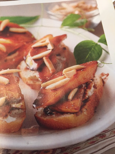 Spread 1 teaspoon of goat cheese on each baguette slice. Top with 2 pear slices, sprinkle with almonds and garnish with fresh pepper, if desired.