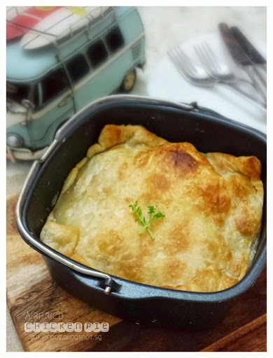 5) On a non-stick baking tray (of Philips air fryer) lay 1 piece of Pampas puff pastry sheet as the pie base, use a fork to gently poke some holes.