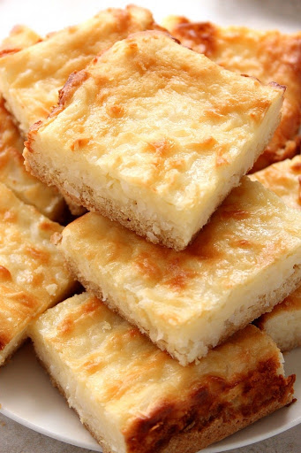 This batch makes 9 good size bars, but you can always slice them into smaller pieces. They are not too rich. I used 1/2 cup of sugar because I used the sweetened coconut here. If you are using unsweetened – you may add 1/4 cup of sugar to the mixture. The crust is my alternative to the traditional graham cracker crust. It is from my favorite