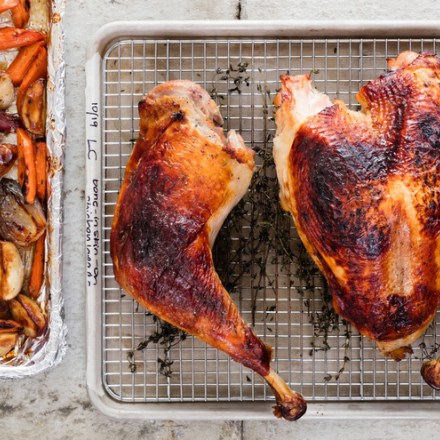 Remove turkey parts from brine and pat dry with paper towels; set aside at room temperature. Adjust oven rack to lower-middle position and heat oven to 400 degrees F/200 degrees C. Line rimmed baking sheet with aluminum foil.