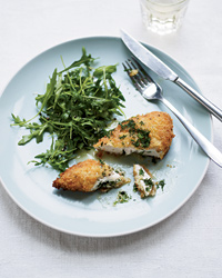 Dredge the chicken in flour, tapping off the excess. Put the eggs and bread crumbs in 2 separate shallow bowls and season with salt and pepper. Dip the chicken in the eggs and then in the bread crumbs, sealing the pockets; dab any open spots with egg and sprinkle with bread crumbs to seal. Place the chicken on a baking sheet and freeze for 5 minutes.