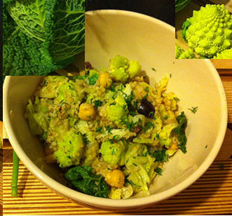 4.) Add cooked bulgur, Romanesco and chickpeas to the cabbage. Toss together with lemon juice, dill and chopped olives.