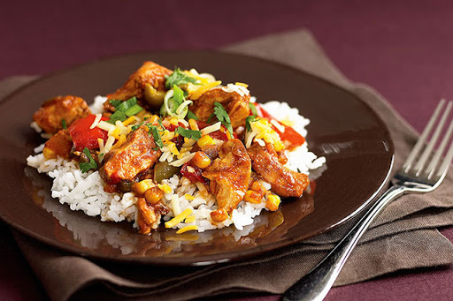 Stir chicken mixture. Serve over rice topped with cheese and onions.