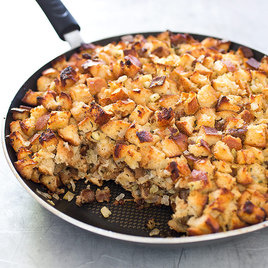 For the ultimate crunch, we don’t merely dry the bread; we toast it at high heat. To further develop its crust, we fry the stuffing in butter on the stovetop, without stirring. Then we brush the top with melted butter and put the skillet in a hot oven so the top can develop a similarly bro