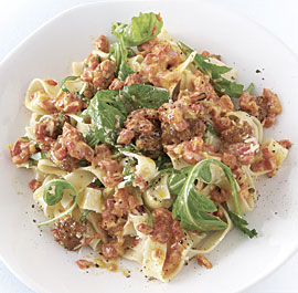 If you usually think of arugula as salad, think again. The bright, peppery green brings vibrancy and freshness to this otherwise rich pasta. Hot Italian sausage will make this dish spicy; for less heat, use sweet sausage.