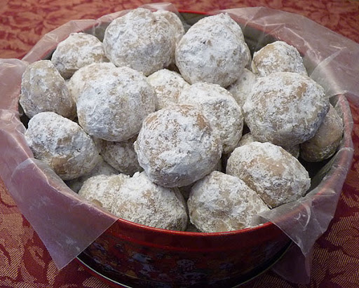 4. While still warm, roll cookies in powdered sugar. When cookies have cooled, roll them again in the confectioners sugar to give them a nice even coating of sugar. Store in an airtight container.