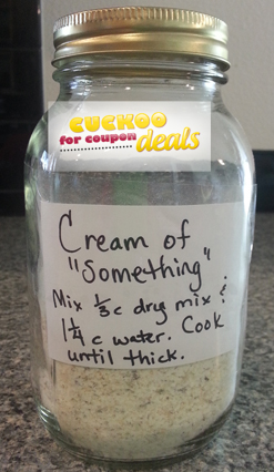 Mix all ingredients together and store. One can of condensed cream soup = 1/3 cup dry mix with 1 1/4 cup water or milk or half and half. Cook until thick.