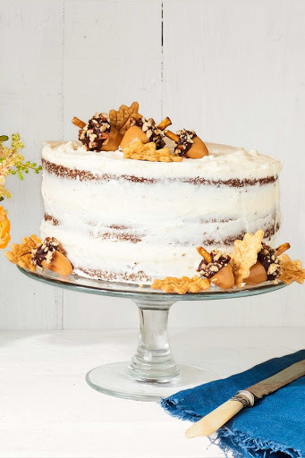 Acorns and Piecrust Leaves: Shape packaged caramels into acorns. Dip tops of acorns into melted dark chocolate. Coat chocolate in finely crushed stick pretzels. Insert a 3/4" piece of stick pretzel into the top to create a stem. Use leaf-shaped cookie cutters to cut shapes from pie dough scraps. Bake at 350 degrees F until golden. Let cool and garnish cake.