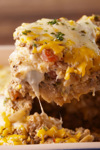 In a casserole dish, place a layer of tortilla chips, ground beef mixture, and cheeses. Repeat until ground beef mixture is used up.