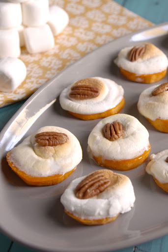 Top each cooked sweet potato round with a marshmallow. Place under broiler and broil until the marshmallow is puffed and golden. Immediately remove from oven and top each marshmallow with a pecan half.