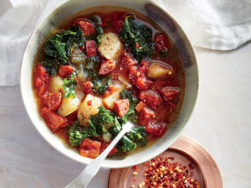 Heat oil in a Dutch oven over medium. Add onion and garlic; cook, stirring occasionally, until tender, about 5 minutes. Add chorizo; cook, stirring occasionally, 3 minutes. Add stock, salt, pepper, potatoes, and tomatoes; increase heat to high. Bring to a boil. Partially cover pan, reduce heat to medium-low, and simmer 15 minutes. Stir in kale; simmer until potatoes are tender and kale softens, about 5 minutes.