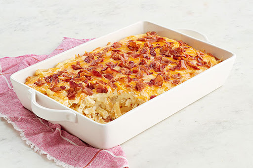 Layer half each of the potatoes, cream cheese mixture and shredded cheese in 13x9-inch baking dish sprayed with cooking spray. Repeat layers; cover.