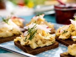 Pat the julienned radish dry. Mound the egg salad on the bread and garnish with radish and dill fronds.