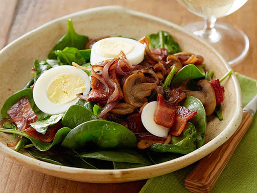 Add the spinach to a large bowl. Arrange the onions, mushrooms and bacon on top. Pour the hot dressing over the top; toss to combine. Arrange the eggs over the top and serve.