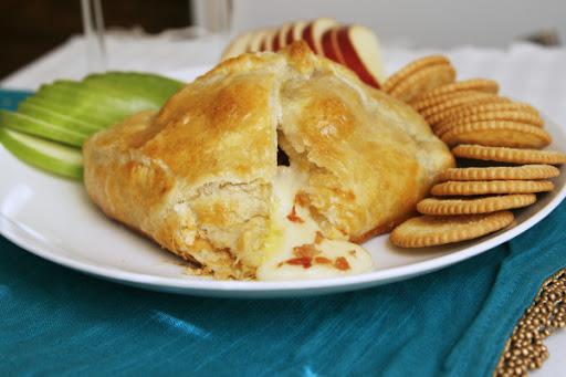 On a parchment-lined baking sheet, roll out puff pastry. Place brie on top and top with all but 1 or 2 tablespoons of maple-bacon mixture. Fold up each corner of puff pastry, brushing each with corner with egg wash.