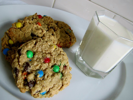 Mix eggs, brown sugar, sugar, vanilla, butter, peanut butter, & baking powder throughly. Add oatmeal, chocolate chips and M&M's. Drop by spoonfuls on baking sheet. Bake at 350* for 12 minutes