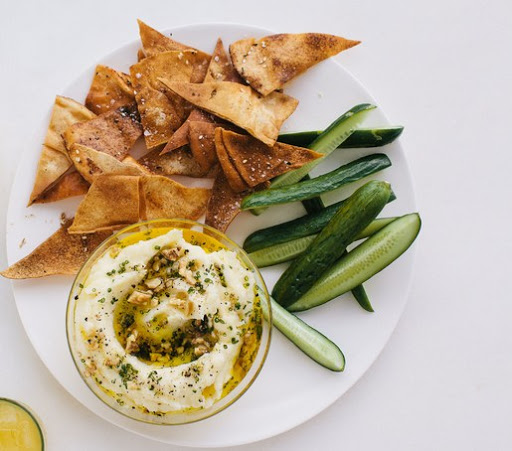 Mix potatoes, garlic, lemon zest, lemon juice, 3 Tbsp. oil, and 2 Tbsp. warm water in a medium bowl; season with salt. Drizzle skordalia with oil and top with chives and toasted walnuts. Serve with pita chips and cucumbers.