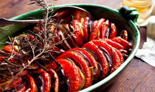 3. Arrange the vegetables in rows in the baking dish in this order: tomato slice, eggplant slice, tomato slice, squash slice, onion slice, tomato slice, eggplant slice, tomato slice, etc. Each slice of eggplant should have a tomato slice on either side. The vegetables should not be lying flat; they should be arranged in the dish as if you had stacked them, then lay the whole stack in the dish, all of the rounds slanting slightly to one side. Insert the herb sprigs into the dish. Pour any juice left in the bowl on top. Cover tightly with foil.