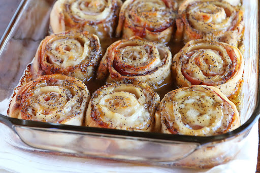 Next combine the butter, brown sugar, Worcestershire sauce, mustard, and poppy seeds in a sauce pan over medium heat. Whisk until the butter is melted and the glaze is smooth and combined. Pour evenly over the rolls.