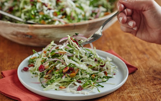 Add the shredded cabbage, almonds, cranberries, and parsley to the dressing and toss to combine. Taste and season with salt and pepper as needed.