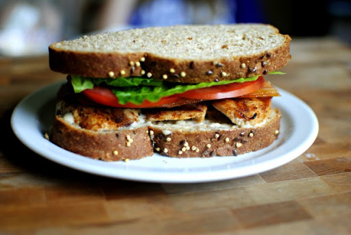 Top with sliced grilled turkey, bacon, tomato, lettuce and the remaining piece of bread.