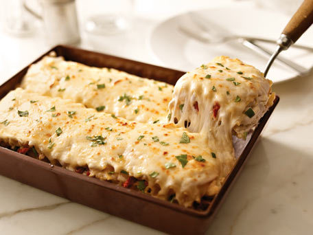 Cover the filling with another layer of noodles followed with the remaining 1/2 of ricotta, 1/3 of the chicken and 1/3 of the sauce.