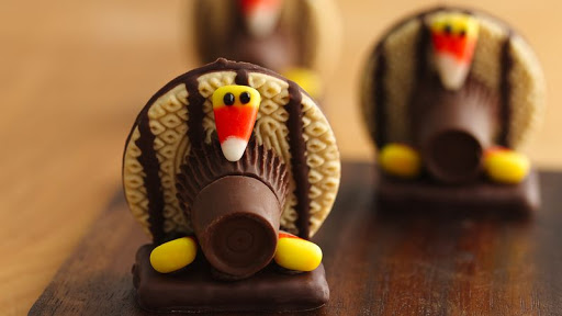 Pipe about 1/2 teaspoon melted chocolate on bottom of 1 round caramel; place on 1 peanut butter cup (for turkey body). Repeat with remaining round caramels. Allow to set up, about 15 minutes.