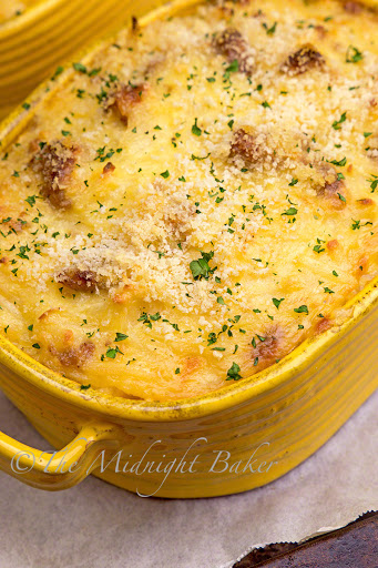 Pour the sauce over the sausage/potato combination in the bowl—the amount of sauce you use it up to you. I used it all because I wanted it creamy. The consistency will be the same cooked as before, so let your eye—and your taste—be your guide. Mix well and turn into prepared pan.
