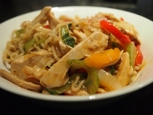 Add the ginger, garlic, celery, red peppers, carrot, bok choy and green onions, and stir-fry for 2-3 minutes. Add the reserved sauce mixture and then the chicken. Simmer until the sauce begins to thicken, about 2 minutes. Add the reserved noodles and toss gently, coating everything well with the sauce. Add sriracha at the end if you want a spicy kick.