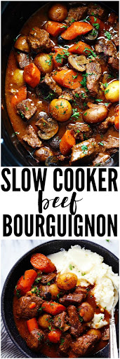 Add garlic, thyme, carrots, potatoes, and mushrooms to the slow cooker. Give it a good stir and cook on low until beef is tender for 8-10 hours and high for 6-8. Garnish with fresh parley and serve with mashed potatoes if desired.