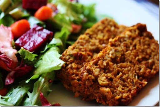 4. Press the mixture into a loaf pan. Brush with ketchup if desired. Cover with foil and bake at 350F for 40-45 minutes, or until a knife inserted into the loaf finds it firm. Remove the foil 20 minutes after the loaf starts baking.