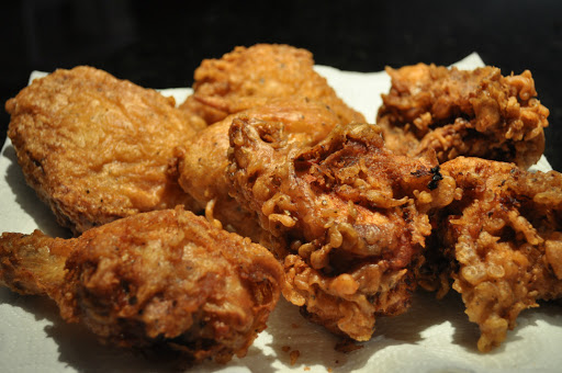 Place the chicken on brown paper grocery store sack. Allow it to drain then pat with paper towels. Repeat with remaining chicken pieces.