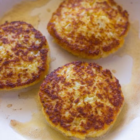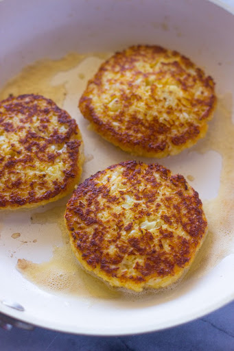 Heat skillet to medium/high heat. Coat with oil (about ½ inch) Form cauliflower mixture into patties about 3 inches across.