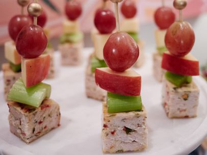 To serve, unmold the meatloaf and cut it into 1-inch squares. Using 4-inch skewers or decorative toothpicks, skewer a grape, a piece each of celery and apple, and, lastly, a cube of meatloaf to use as a base. Stand the skewers upright on the meatloaf.