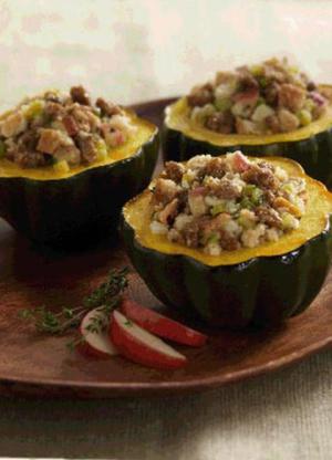 Divide the stuffing evenly among the acorn squash halves. Arrange the halves in a roasting pan and pour water around (not on) the squash to 1 inch.