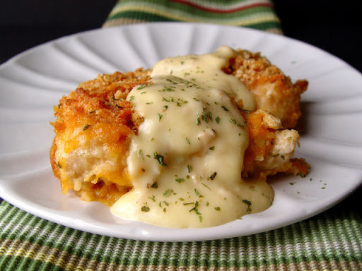 Dip each piece of chicken into the milk then the cheese. Press the cheese into the chicken with your fingers. Some of it will fall off when you add it to the cracker crumbs, don't worry about it. Press the cheesy chicken into the cracker crumbs and press it in. By the time you are coating the last piece of chicken, the dish you are using for the crumbs will be full of cheese. Don't let it get you down. Once the cheese melts in the oven it will adhere nicely to the crumbs and the crackers.