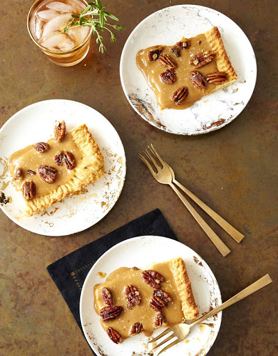 Spread caramel over cooled pastry crust and top with caramelized pecans. Garnish with a pinch of sea salt before serving.
