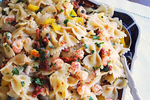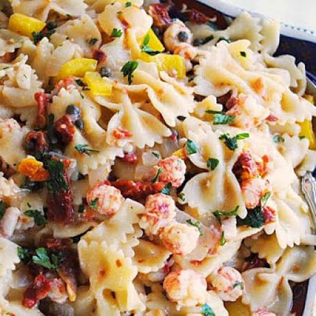 5.Stir in the langostino, sundried tomatoes, crushed red pepper, and the capers. Cook and stir until the langostino has warmed through.