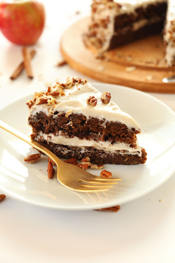 Once the cake is completely cooled, add 1/3 of the frosting to the top of the bottom layer and spread into an even layer. Then add the top layer of cake and frost generously with remaining frosting, coating sides last. Add crushed pecans on the edges (optional), slice and serve.
